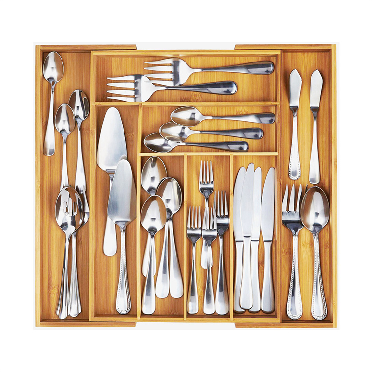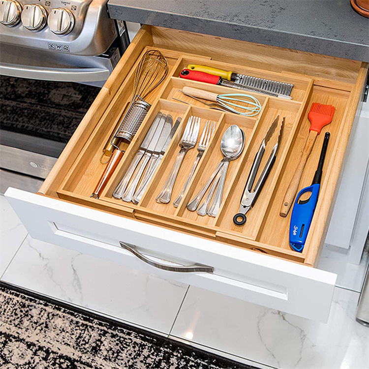- CLUTTER FREE STORAGE: Our cutlery organizer is great not only for storing flatware, but also as a kitchen drawer organizer for large utensils such as spatulas, tongs, ladles, and more. Find all your kitchen gadgets in one spot and hassle-free thanks to our organizers’ tall compartment walls. Take advantage of our beautiful bamboo organizers’ expandability and 9 main compartments.