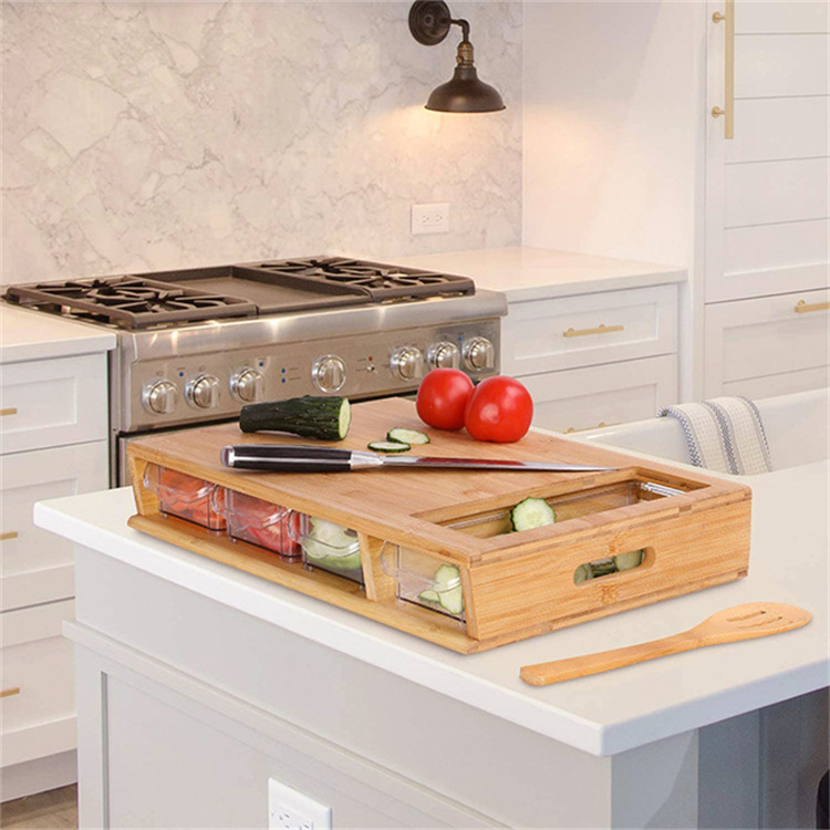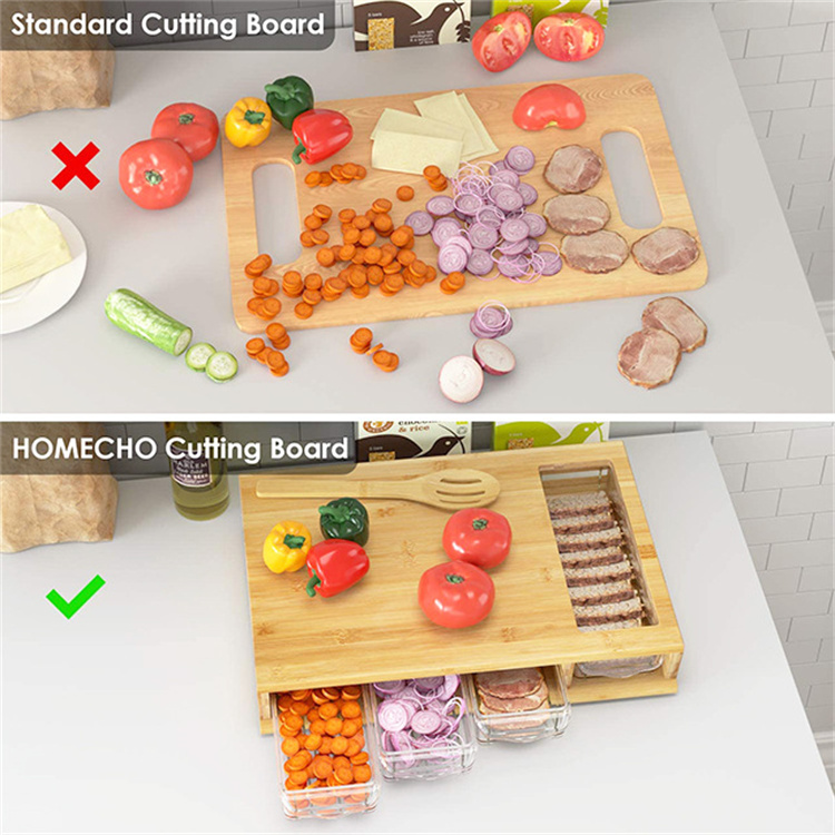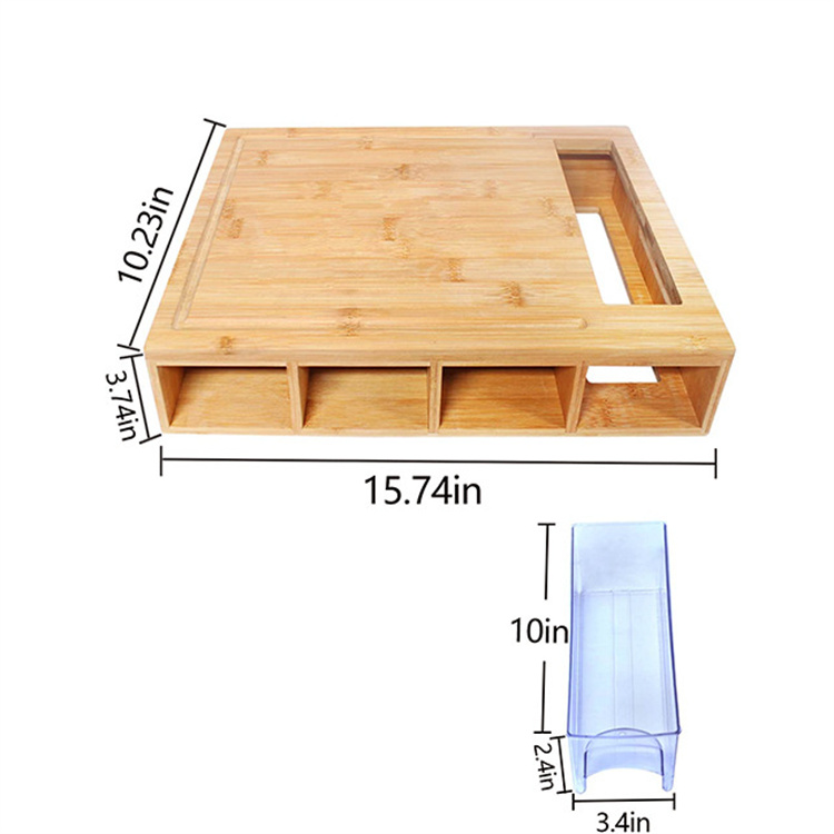 - Easy to Use : This 17.5” x 12.4” cutting board with storage is the right size for all kinds of food prep. The double-sided chopping station caters to left- and right-handed use. The prep deck is designed with juice grooves to catch excess juices for a mess-free countertop. Easily move the cutting board from the countertop to the table with the indented handle on both sides. Rounded corners on all sides for a safe environment to prepare food.