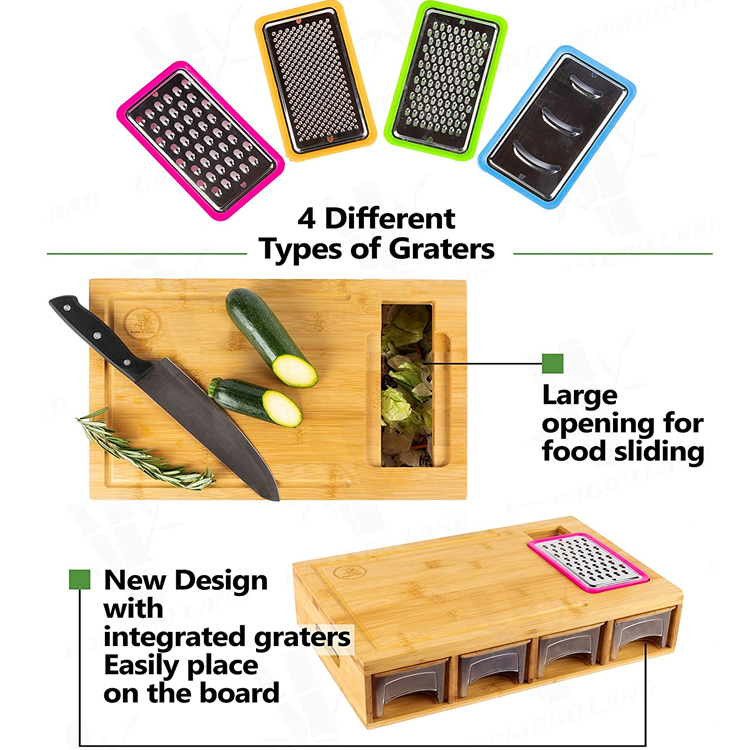- 4 Graters and Slicers: Our large cutting board set is equipped with 4 sharp stainless steel blade slicers, used to slice or grind vegetables, fruits and cheese. The teeth of the grater will not clog, so it is easy to clean. Just pass it under running water. The design of the deep juice trough around the tidy board prevents the juice from flowing away from the board. Lock the water completely on the groove. Keep the kitchen tidy.