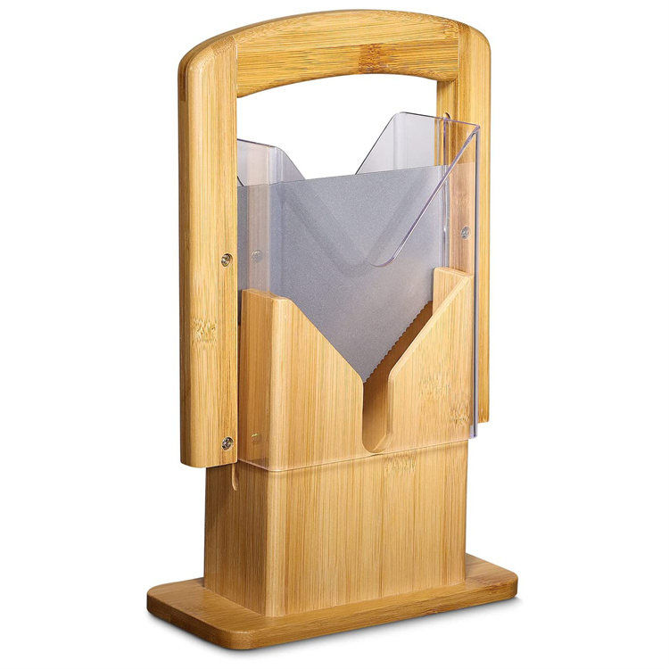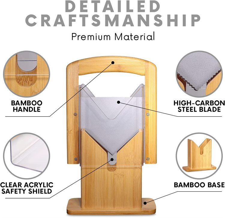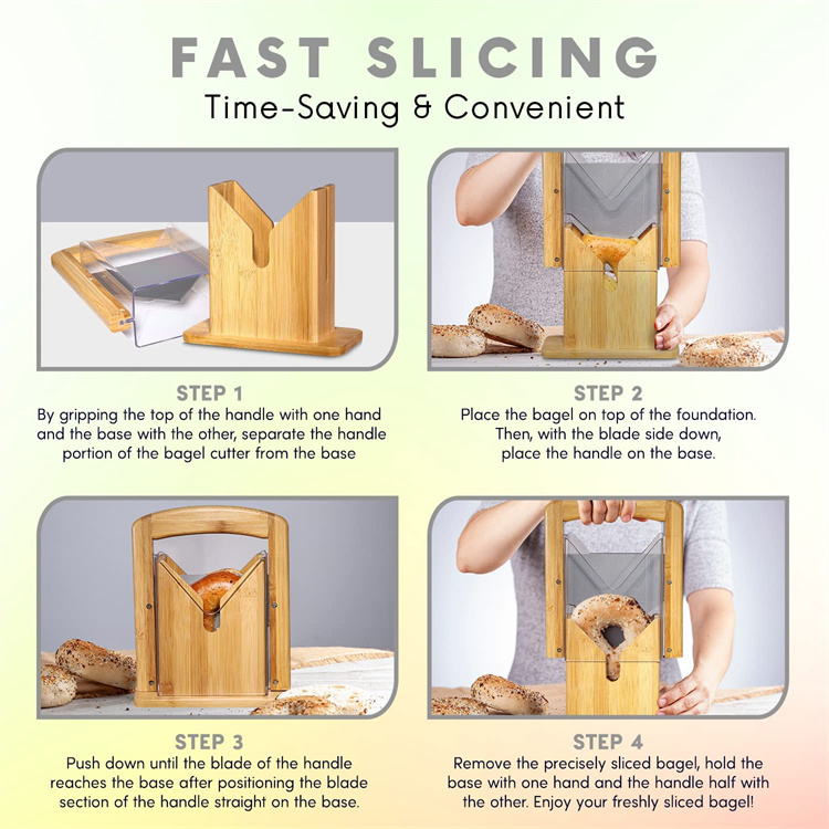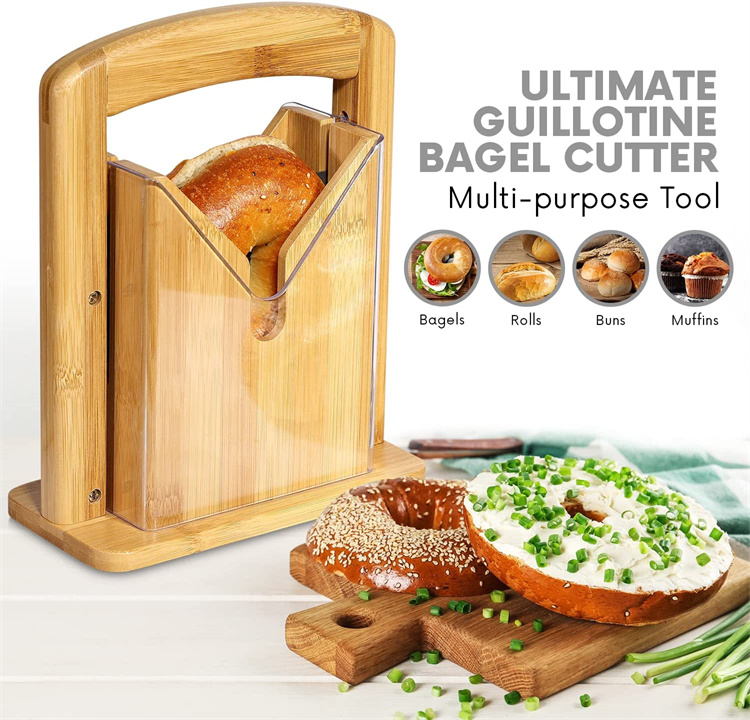- DETAILED CRAFTSMANSHIP – Complement your classy kitchen with the premium workmanship of our bagel slicer with the wooden guard edge, highly stable base, a guillotine-like high-carbon steel blade and a clear polycarbonate shield for protection.