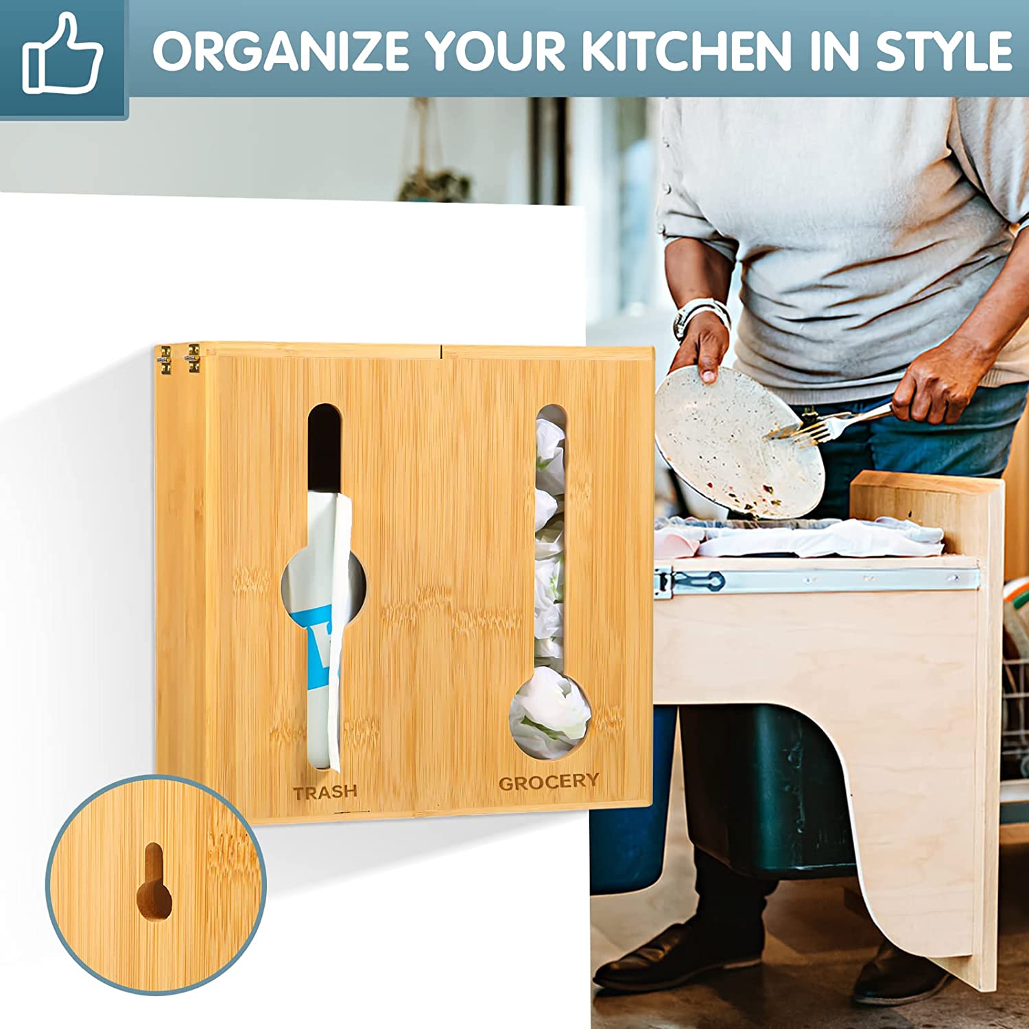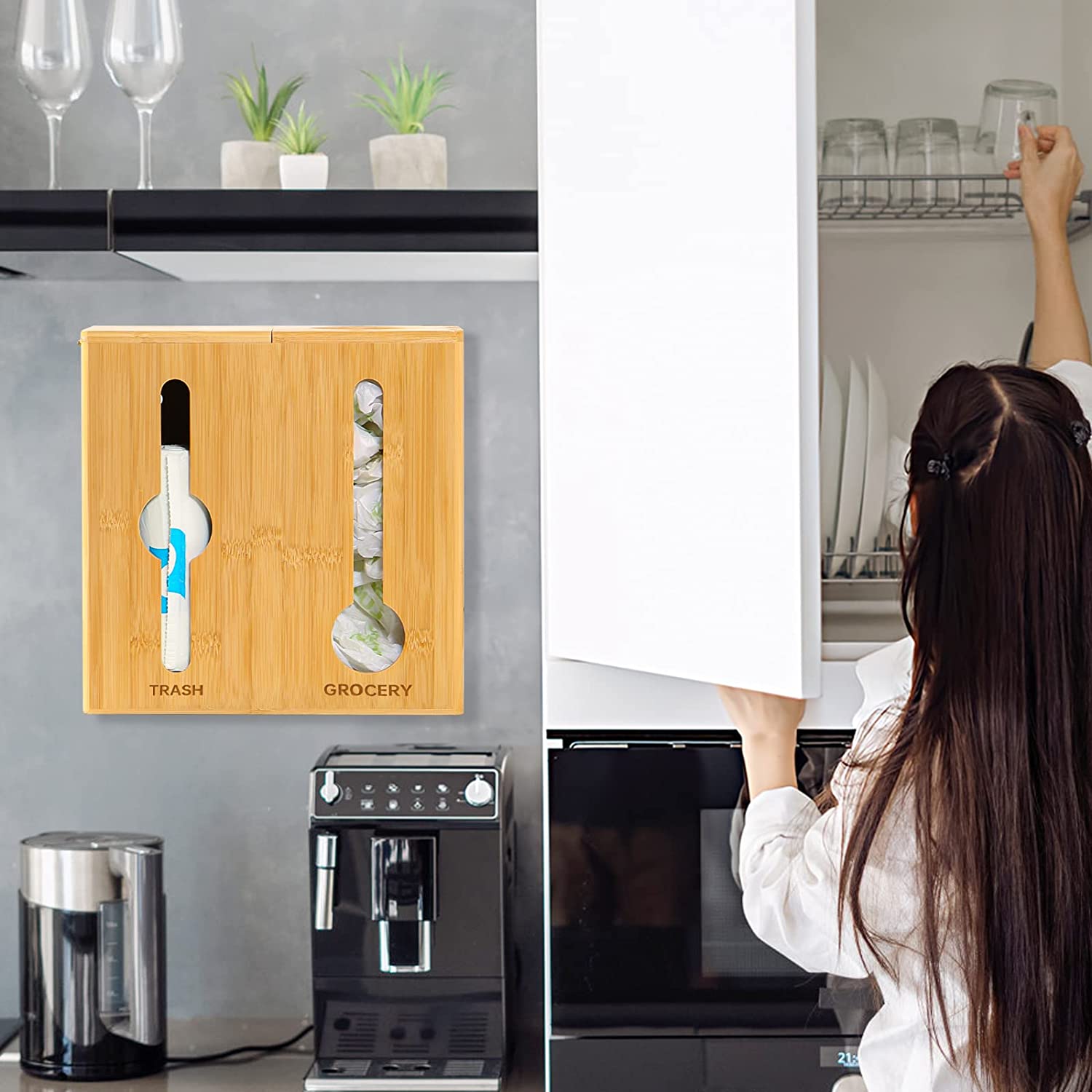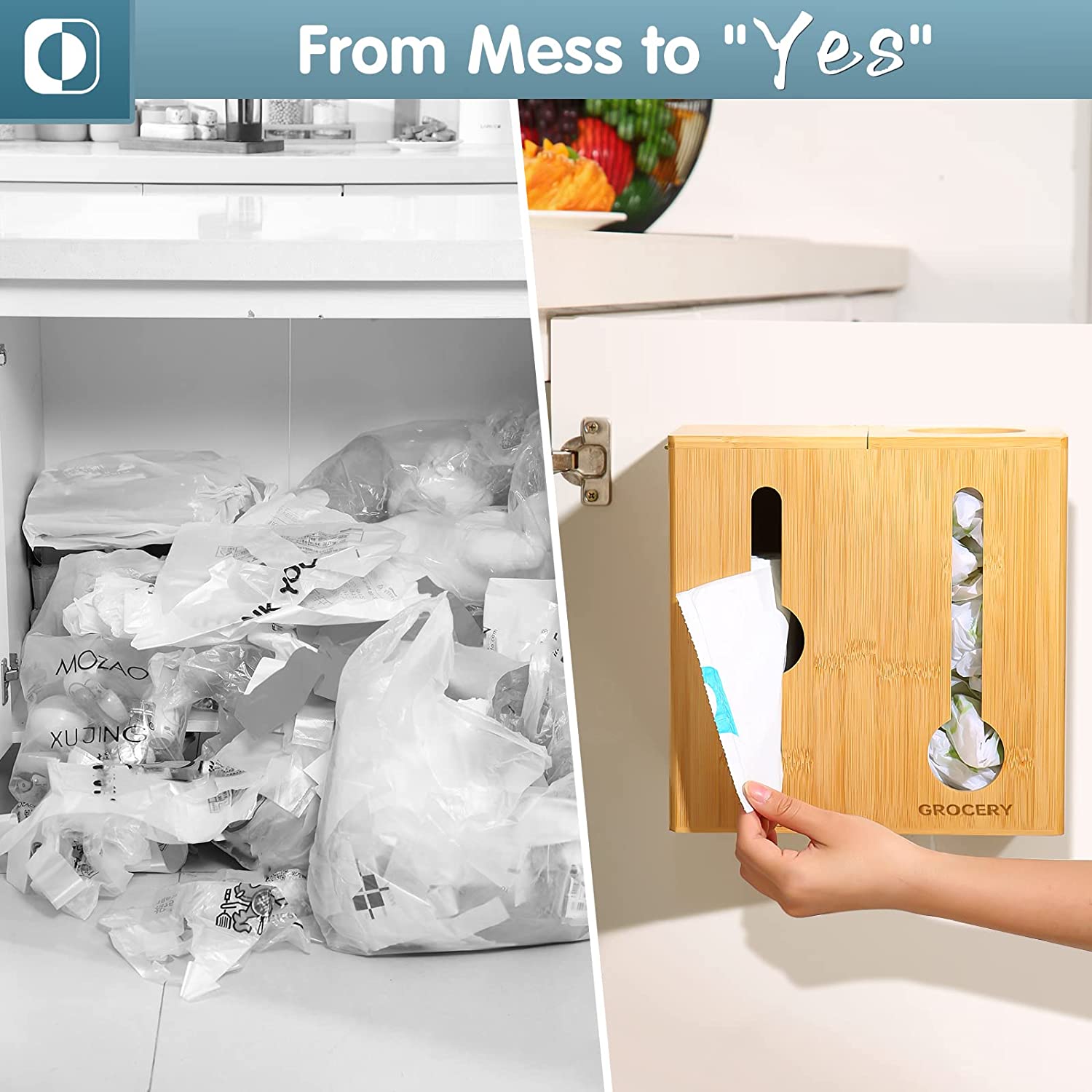 - 【FROM MESSY TO TIDY】Tired of dealing with a bunch of messy plastic bags? Always scrambling for trash bags when you need them? We’ve got the solution for you. Check out our 2-in-1 Grocery and Garbage Bag Organizer, perfect for keeping your home neat and tidy. It’s wall-mounted, too, so you can keep it out of the way and save some space.